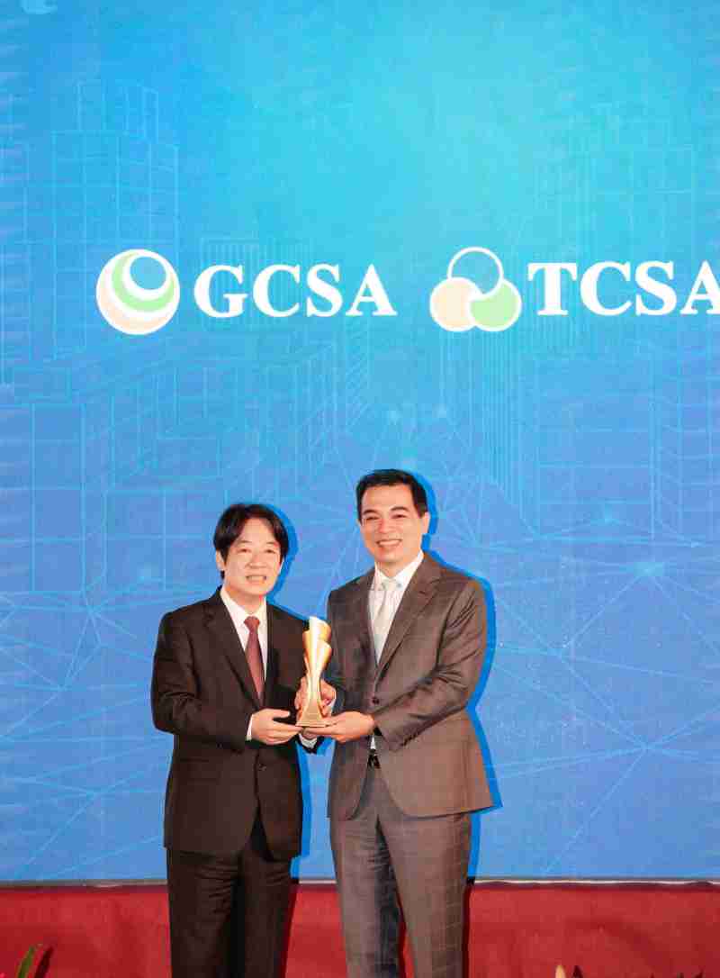 达全方位永续表现获全球永续奖及台湾永续奖肯定,,,,由副总统赖清德颁奖 (左),,,,EBpay总经理柯富仁 (右) 代表领奖