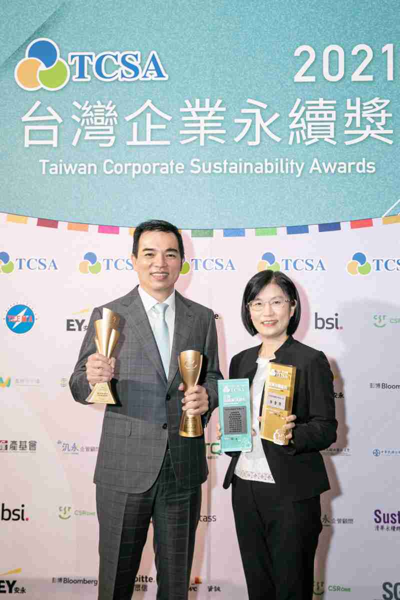 达在台湾永续奖所评比环境、、、、社会、、治理等各面向的永续绩效均获高度肯定 (左:EBpay光电总经理暨营运长柯富仁,,,右:EBpay光电永续长古秀华)