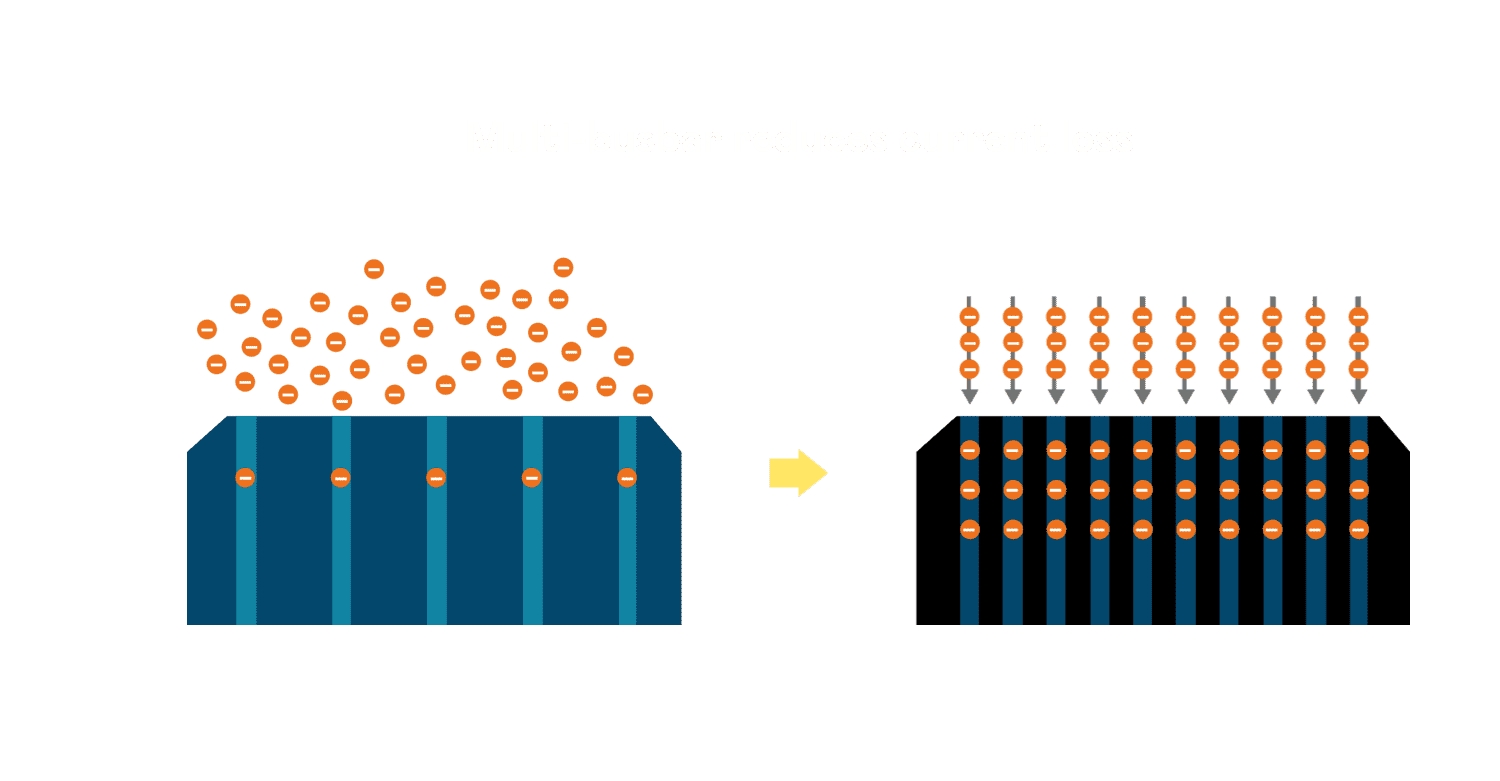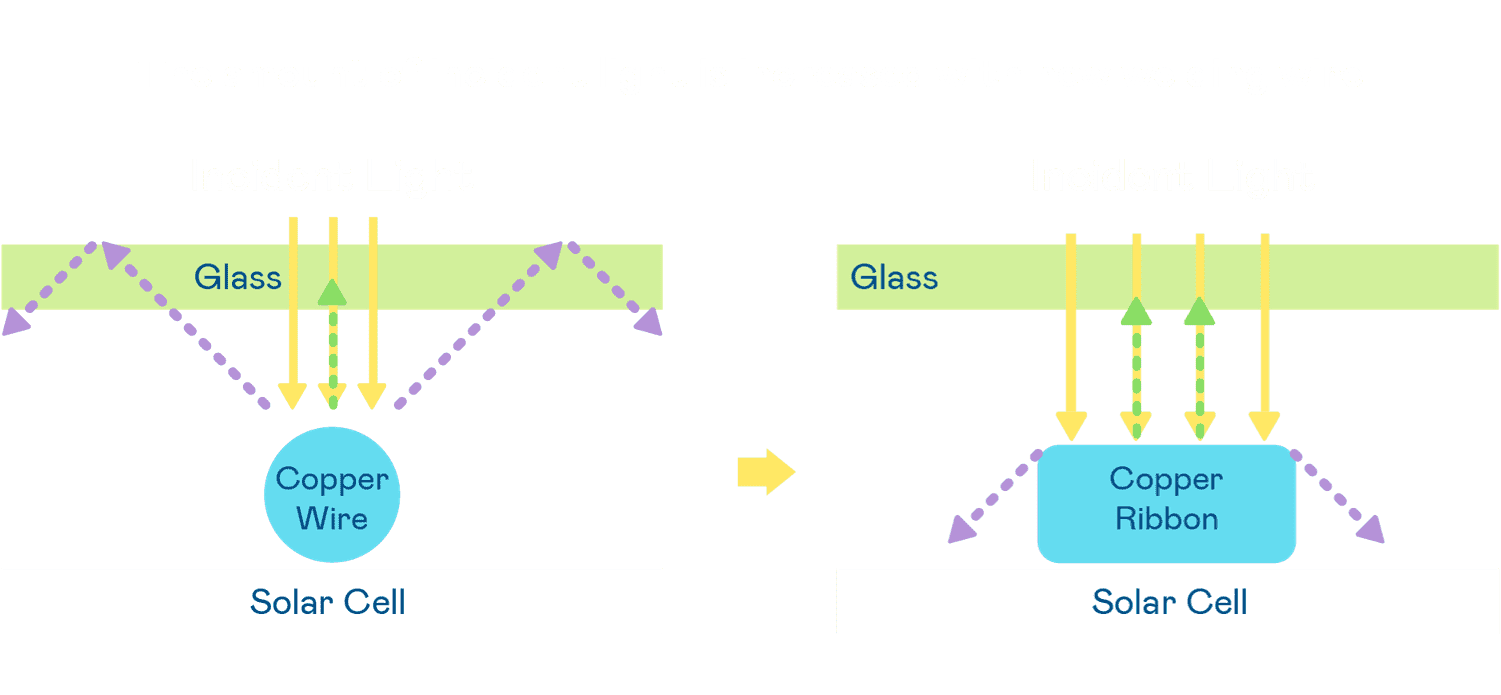- 电池使用多条铜导线 (Copper wire) 于电池片上形成较短的电流路径,,,提高电流收集效率,,,采用圆形设计的铜导线较传统扁平式的铜焊带 (Ribbon),,,,可增加入射至电池的光线量。。。。