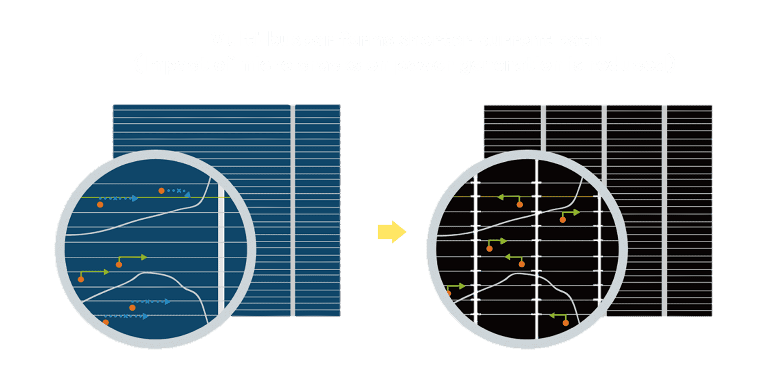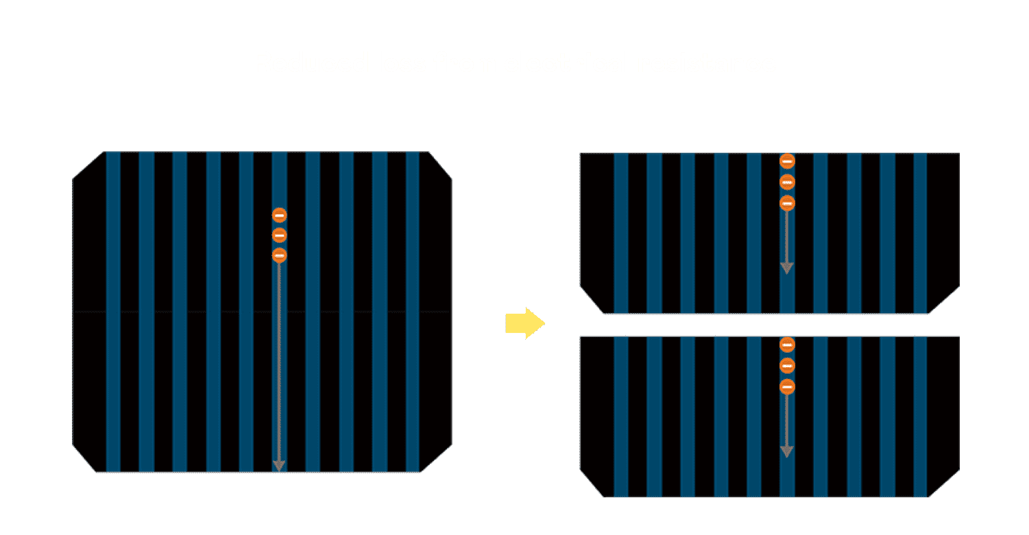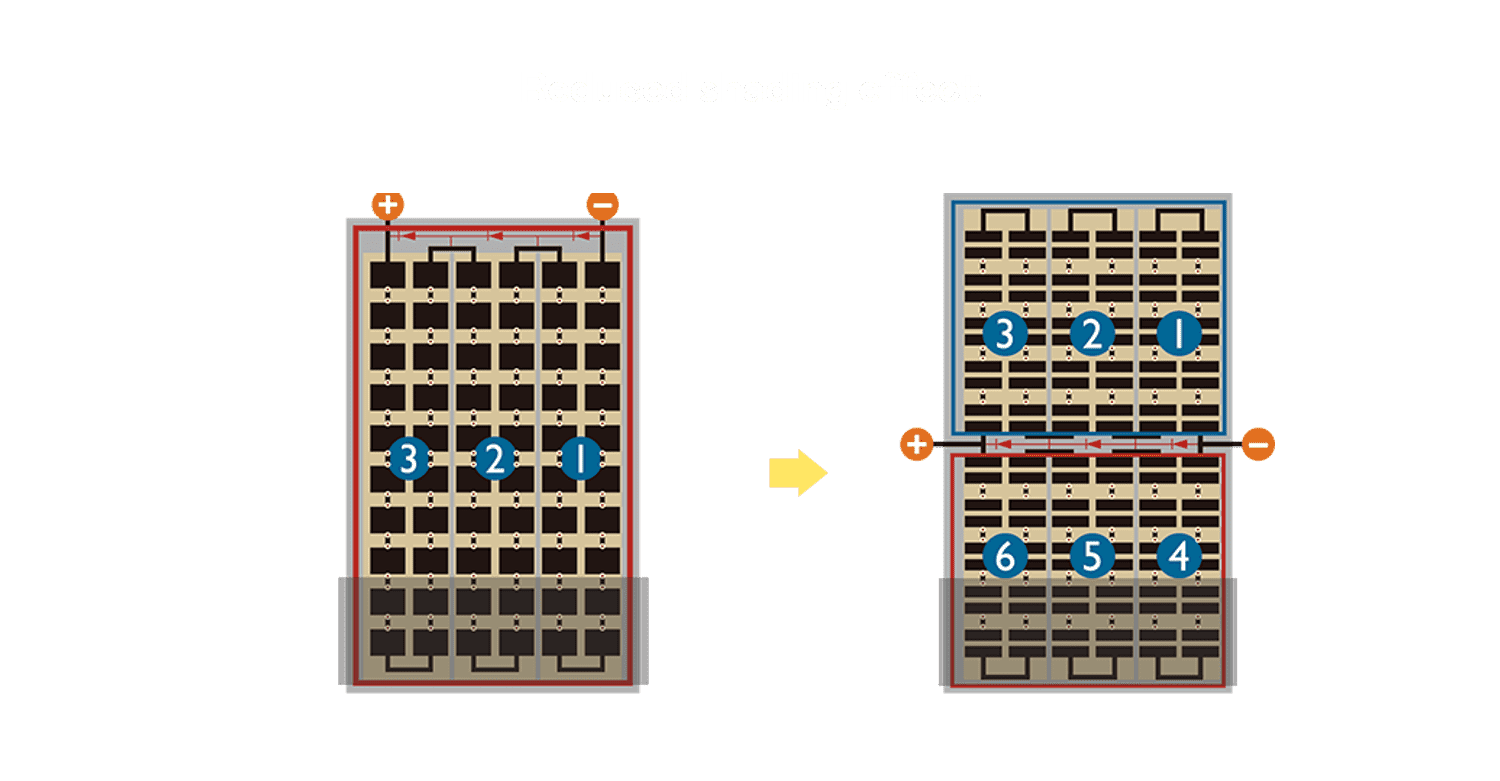 - 结合半切电池,,,降低遮阴影响、、提升模组抗隐裂能力、、并减少电阻损耗,,进一步提升模组发电效能。。。。